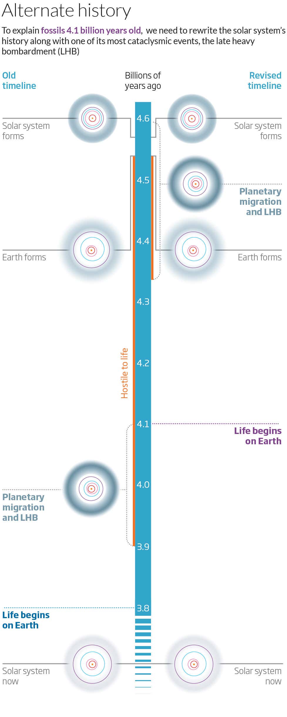 What’s more, these first living organisms would date from a time before our planet was thought capable of harbouring any life at all. In these early years, Earth was supposedly a molten hellhole racked by volcanism and bombarded by space debris, zinging around a solar system yet to find inner peace. If Harrison’s fossils are all they seem, they wouldn’t only rewrite the history of life and Earth – but the entire solar system’s as well.