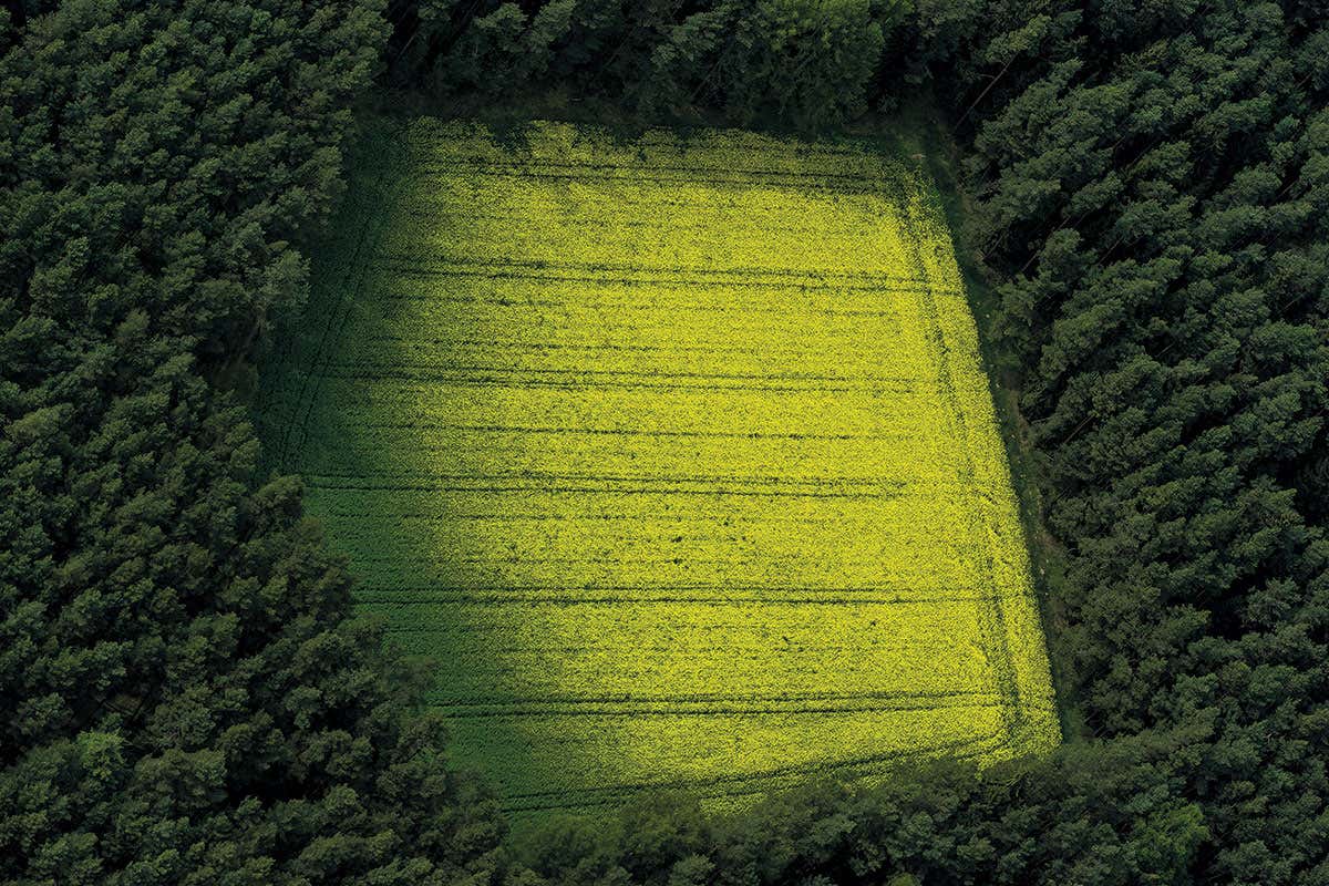 The photograph below is another bird’s-eye view, this time of a field in Germany. The shadows cast by surrounding trees have stopped some of the rapeseed plants from flowering.