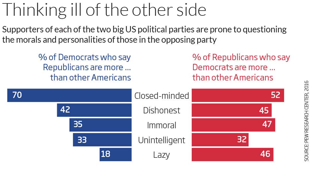 The US has never been afraid to disagree. Founding father Alexander Hamilton extolled a system that encouraged “differences of opinion, and the jarring of parties”. But in the 2016 presidential election, political opponents aren’t merely people you disagree with; they are “deplorables” or “crooked”.