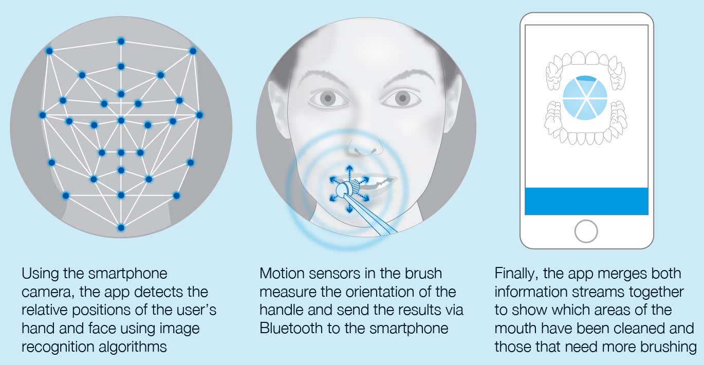 But the angle of the brush doesn’t reveal what part of the mouth the brush is in contact with. So P&G scientists partnered with the world-renowned Fraunhofer Society for the Advancement of Applied Research to develop an app that users download to their smartphone. The app uses a phone’s camera and facial recognition technology to measure the position of the brush relative to the mouth. Oral-B calls this Position Detection Technology.