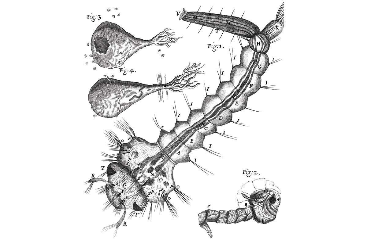 Hooke chose subjects he thought looked attractive for his idealised and ordered catalogue of the microworld, including poppy seeds (above), an insect larva (below the poppy seeds), and a louse clinging to a human hair (below). Before drawing the head of a fly (top), Hooke first detached it so he could observe the organs inside the animal’s abdomen.