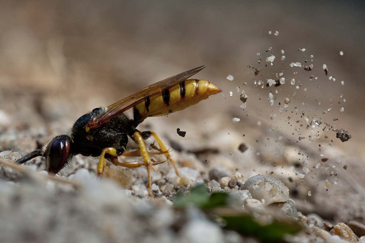 The beewolf then carries her victim to an underground lair. The photo below shows the wasp digging its burrow, which can be up to a metre long, with sometimes dozens of side tunnels, each ending in a brood chamber. Although the insects are solitary, they often build brood tunnels in congregations, so a sandy bank might house thousands of burrows.
