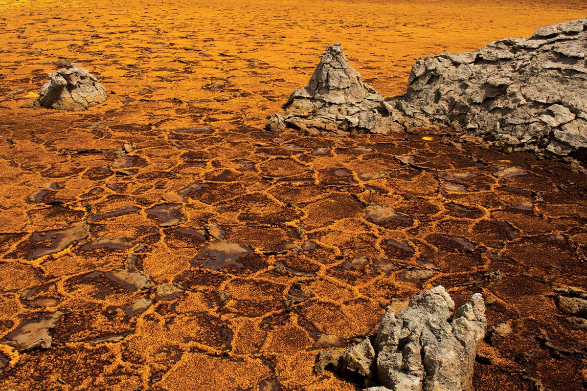 The harsh environment sits at the Afar triangle, where three tectonic plates are gradually pulling apart. As the ground splits open, geothermally heated groundwater rises to the surface and evaporates, leaving a carpet of brightly coloured salty deposits. One day, when the tectonic plates drift far enough apart, the area will become the birthplace of a new ocean.