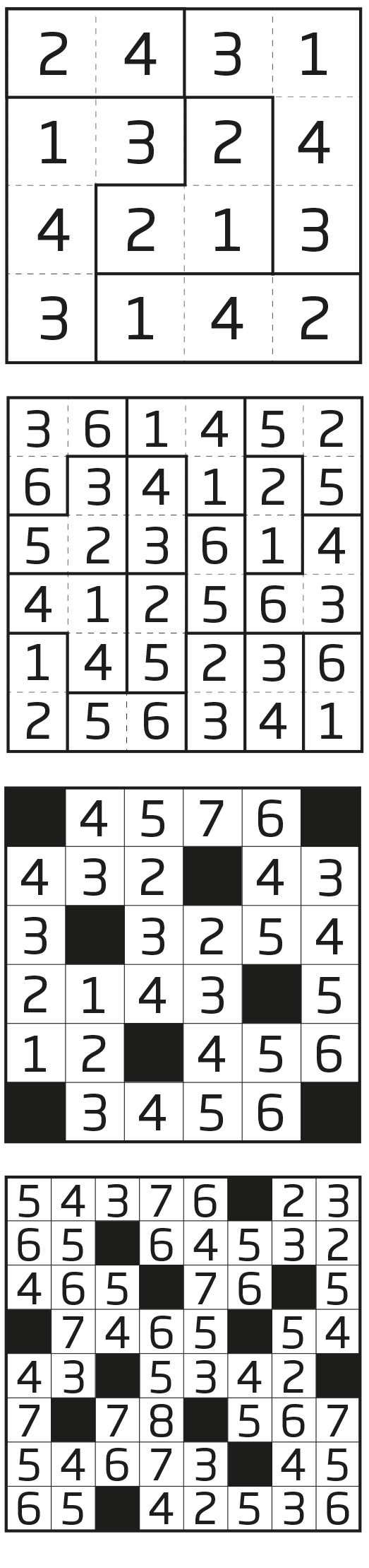 Well done – I hope you didn’t find the puzzles too hard! The key to solving the KenKen is to start by looking at cages with the biggest numbers, since the operation required must be multiplication. And remember, a number can be repeated in a cage if it appears in different rows and columns.