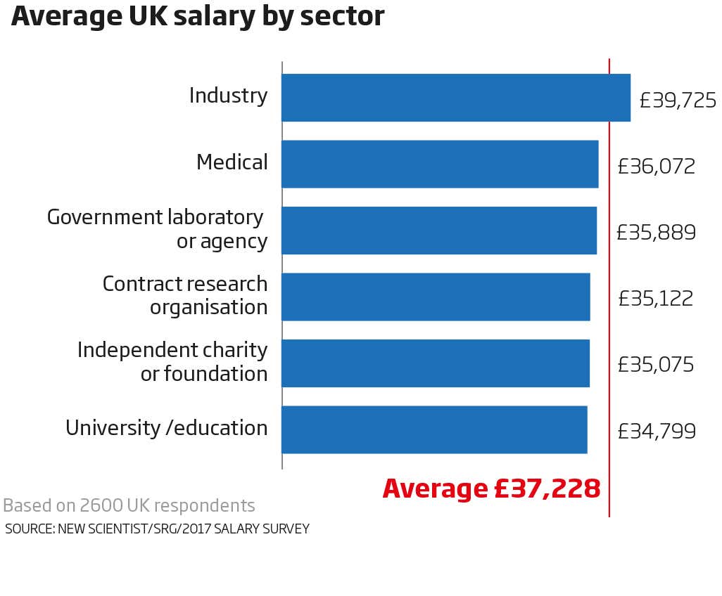In the UK, respondents working in industry have the highest average earnings at around £40,000. Then come those carrying out medical trials, in government labs or agencies, at contract research organisations, in charities and foundations, and academia (see “Average UK salary by sector”).