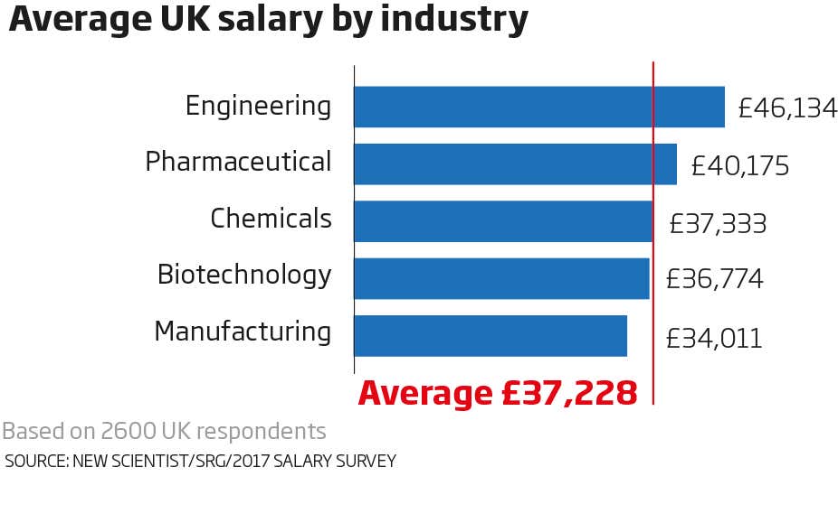 There are large variations here by sector, too. Engineering and pharmaceuticals are the most lucrative, with average salaries of around £46,100 and £40,200 respectively. The least well paid are people working in biotechnology and manufacturing (see “Average UK salary by industry”).