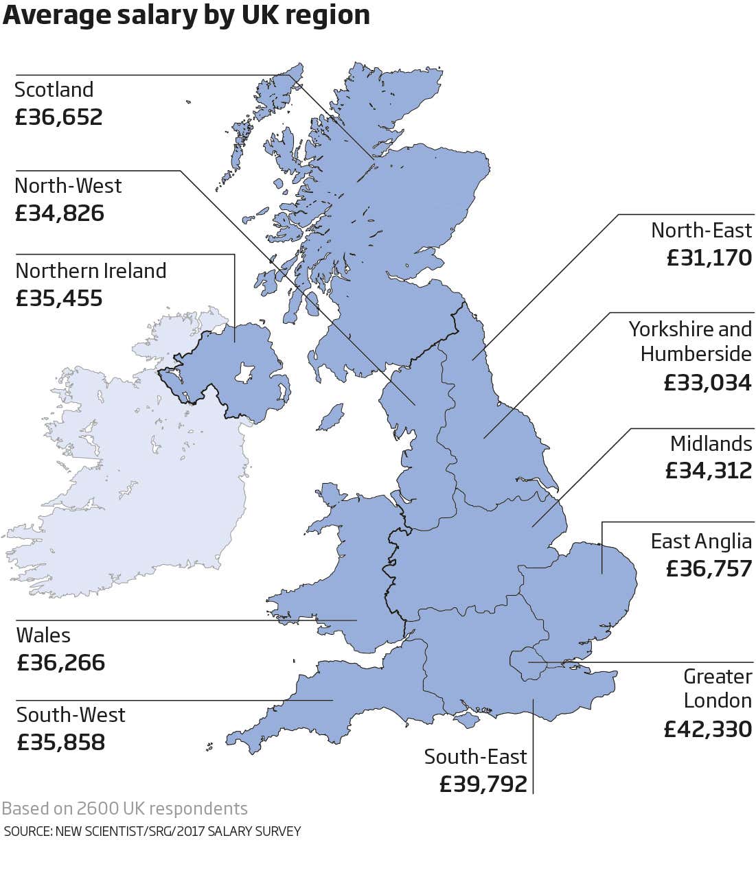 Survey respondents in London had the highest average salaries, closely followed by those in the South-East. The regions with the lowest salaries were the North-East and Yorkshire and Humberside (see Map). There was a crumb of comfort for those in the North-East, where the average reported salary increase was 2.85 per cent in 2017 – the highest in the UK and almost 1 per cent above that in London.