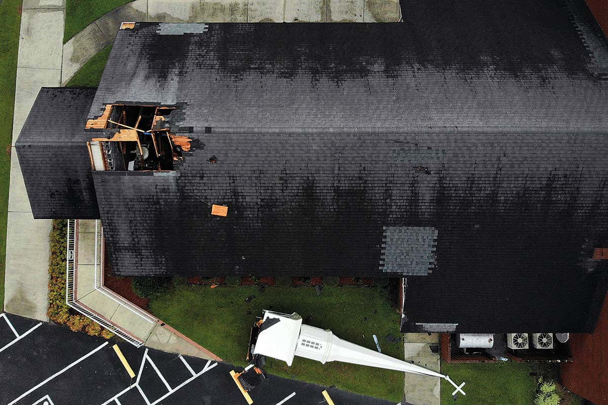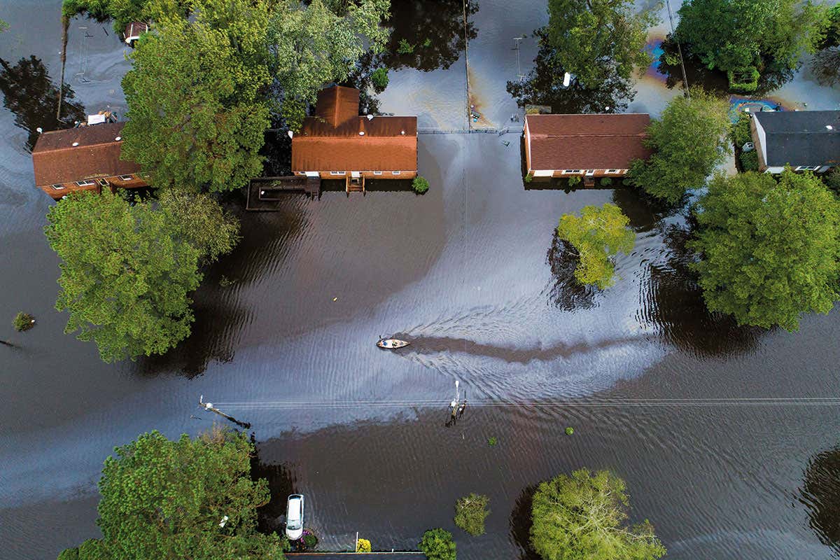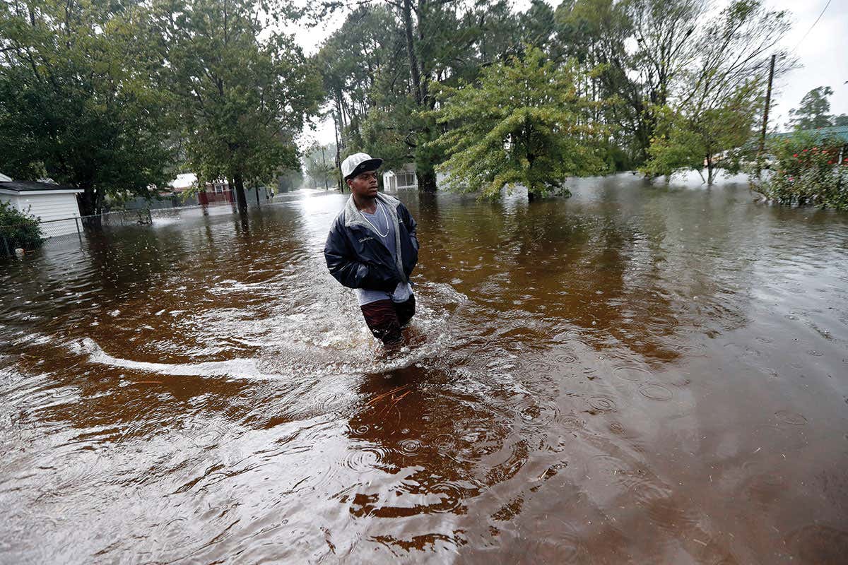 Florence brought torrential rain to the south-eastern coastline of the US, forcing this resident of Marion, South Carolina, to wade through high floodwaters (below, bottom). In New Bern, North Carolina, two residents can just be seen paddling in a canoe through a flooded street (above). Winds unleashed by Florence ripped the steeple clean off the Elah Baptist Church in Leland, North Carolina, on 15 September (directly below).