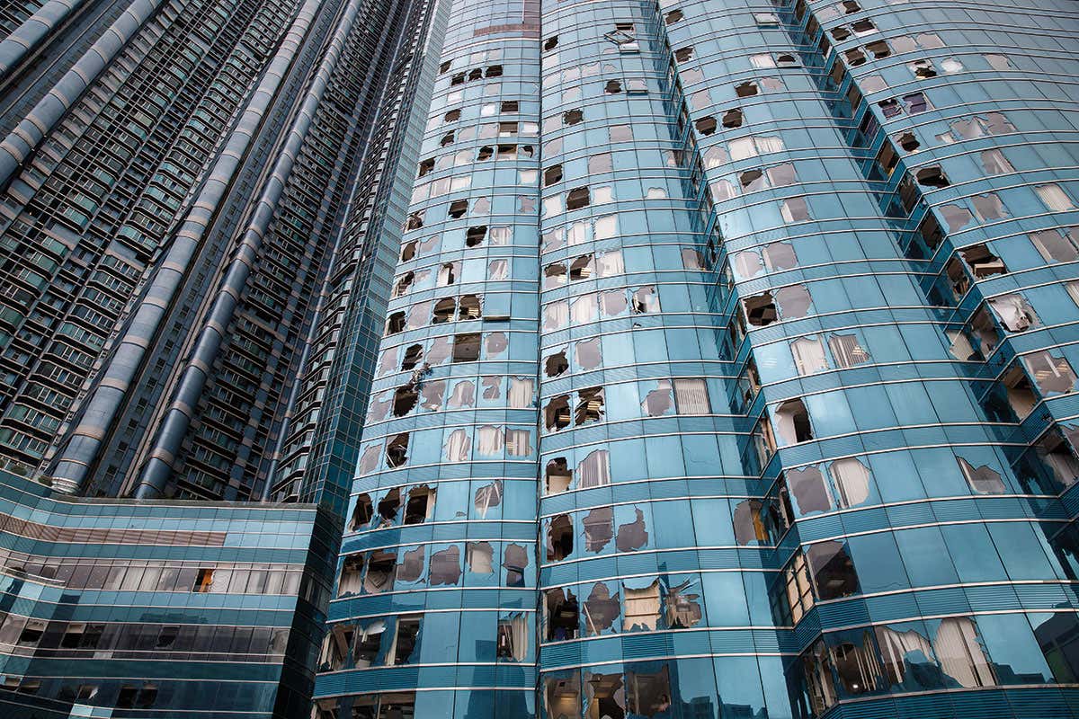 On the same day on the other side of the world, Typhoon Mangkhut began tearing through the Philippines. Marines can be seen here repairing their makeshift barracks in Cagayan, towards the northernmost tip of the country (bottom). Guandong province in southern China was also hit over the weekend – the pedestrians shown here are struggling against the wind and rain in the city of Shenzhen (top photograph). In Hong Kong, the windows were blown out from One Harbourfront, a major commercial building (below).