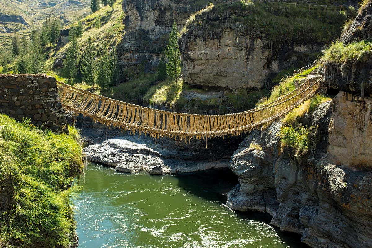 They certainly went to great lengths to transport the khipus. Couriers would loop the cords over their shoulders and run with them across the empire. To navigate the terrain, a vast network of roads and woven grass bridges were built. The last remaining bridge, known as Queshuachaca (bottom), straddles a river high in the Andes. Local people band together to renew the woven grass ropes every year.