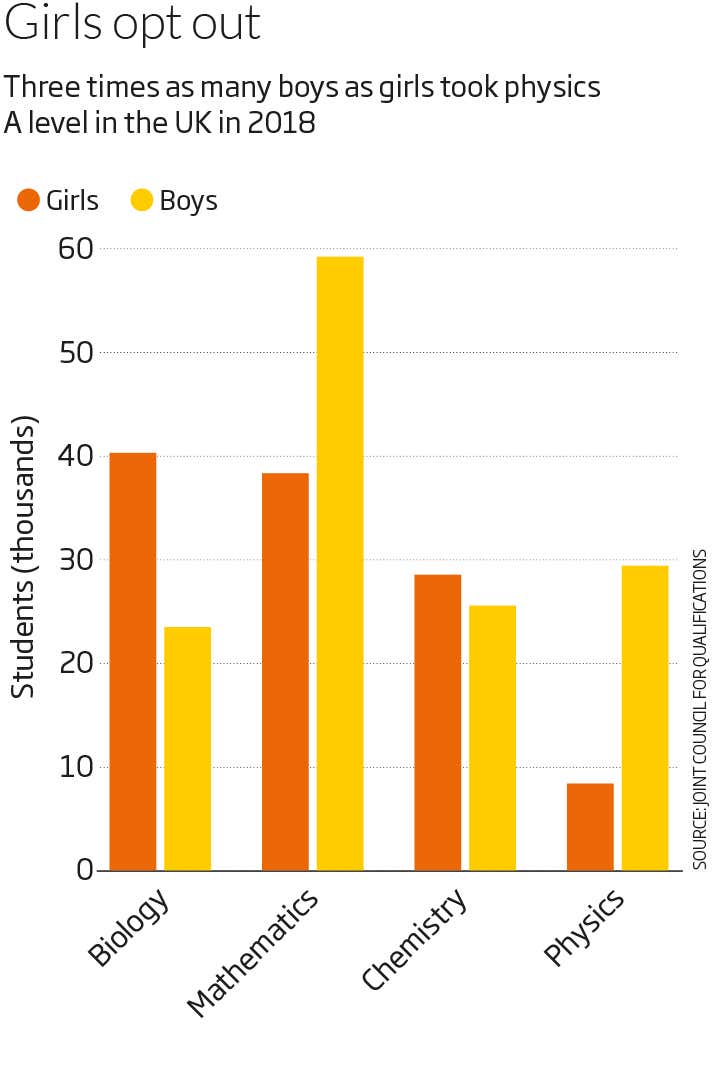 The problem is that this is minuscule compared with the 29,400 boys who chose it (see “Graph”). Physics was the second most popular subject for boys at A level, yet the 18th most popular for girls. “Many girls who could have had careers in physics are dropping out. It’s a terrible shame that we’re losing that amount of talent,” says Julia Higgins, president of the Institute of Physics.