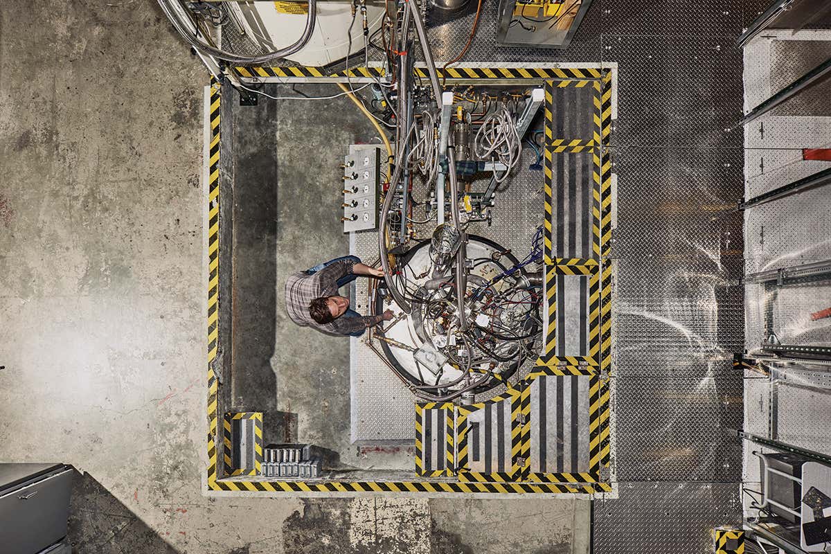 Research engineer Nick Force works on ADMX’s largest magnet, which produces a magnetic field 150,000 times stronger than Earth’s Tony Luong/www.tonyluong.com