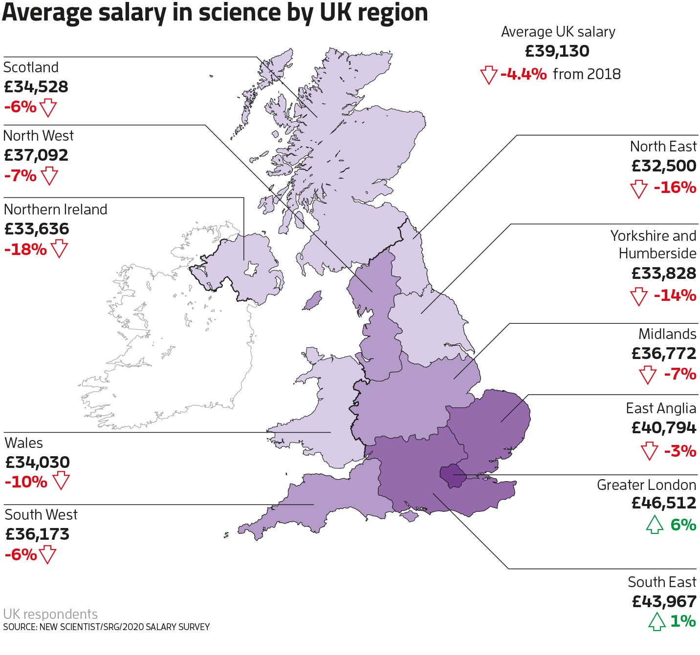 The 2018 edition of the survey contained unadulterated good news for science jobs in the UK. There was an almost double-digit percentage increase in the average salary compared with the previous year. This year’s figures aren’t so healthy. Between 2018 and 2019, STEM salaries suffered a setback as the average dropped from £40,925 to £39,130. This is probably part of a general economic trend amid the disruption of Brexit. The UK’s Office of National Statistics reports that 36 per cent of full-time employees experienced a real-terms pay decrease or pay freeze in 2019. The UK government’s promise to increase domestic research funding to £18 billion by 2025 may, however, mean the trend is short-lived.