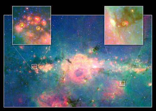 The Spitzer Space Telescope has used its infrared vision to peer through the dusty, crowded region at the centre of the Milky Way to reveal three baby stars that are each less than about 1 million years old (circled). The discovery of young stars in the region has been a puzzle to scientists, since violent gravitational forces near the colossal black hole at the galaxy’s heart can rip gas clouds apart, making it hard for stars to condense there.
