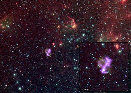 The remnant lies about 190,000 light years away in the nearby Small Magellanic Cloud galaxy. (X-ray (purple) image: NASA/CXC/Penn State/S. Park & J. Lee; infrared (green and red) image: NASA/JPL-Caltech)