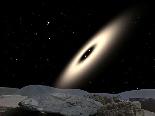 The two solar-mass stars in this system lie just 7 million km or so apart, or about 4% the Earth-sun distance, and the disc around them extends from within Neptune’s orbit around the sun to about 10 times that distance. Researchers believe gas giant planets like Jupiter may lie in the disc.