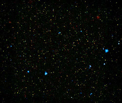 Blue blobs mark the spots where the monster black hole at the centre of our galaxy is acting up, throwing off small but bright high-energy X-ray flares as it munches on in-falling matter. In other large galaxies, the central black holes are so voracious that matter is constantly swirling into their bellies. They compress this material so much that it gets hot enough to glow with X-rays. But the Milky Way’s black hole is oddly dim, except for the occasional outburst.