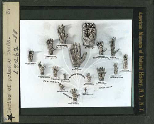 Little is known about this lantern slide other than that it depicts a series of primate hands in an taxonomic tree. Originating from the hand of the lemur, the tree has various branches including the anthropomorphic cluster that includes the human hand and the remarkably similar hands of the gorilla and chimpanzee.