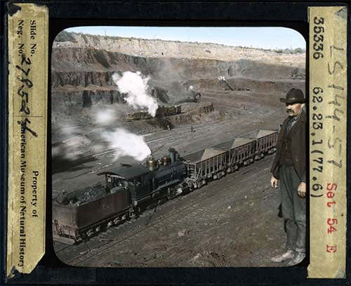 This lantern slide by an unknown photographer shows the engine room of the US at the turn of the century: an open-cast iron mine, with its steam train and 5-ton steam shovels, around 1906 in Hibbing, Minnesota.