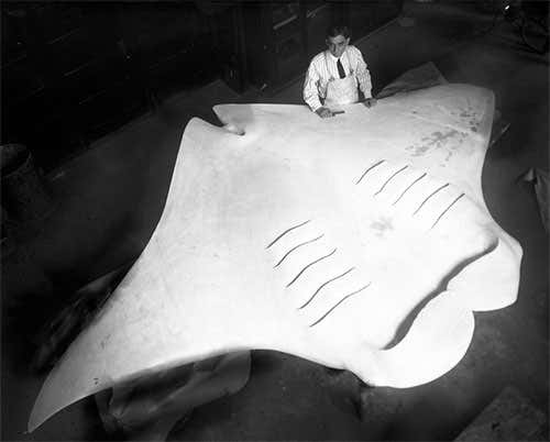 This photograph, taken by Julius Kirschner, is titled “Mr Bell working on devil fish manta, 1917”. The plaster model of the colossal ray was created in the Department of Preparation for an exhibition at the museum – the wooden frame inside the model was also captured on film. Manta rays were dubbed “devil fish” because of the horn-like fins on their heads.