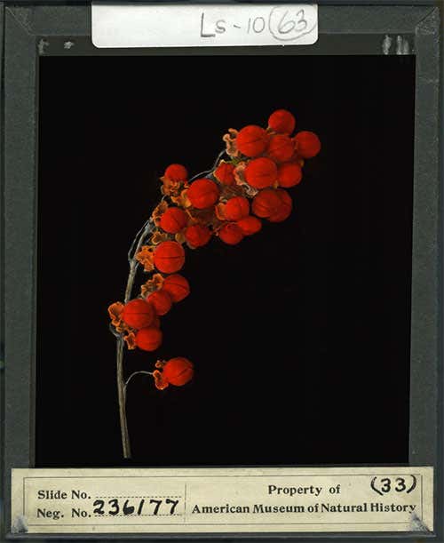 This lantern slide, by an unknown photographer and from an unknown date, shows the American bittersweet, Celastris scandens. The fruit is a delicacy for birds but poisonous to humans, and was used by Native Americans to induce vomiting as a treatment for venereal disease and tuberculosis.