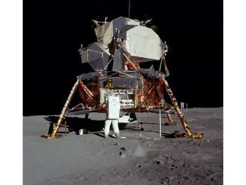 This image of Apollo 11 astronaut Buzz Aldrin in front of the lunar module Eagle provides a sense of scale to interpret the LRO images taken from orbit. The lunar module is about 4 metres wide. (Image: NASA/Neil Armstrong)