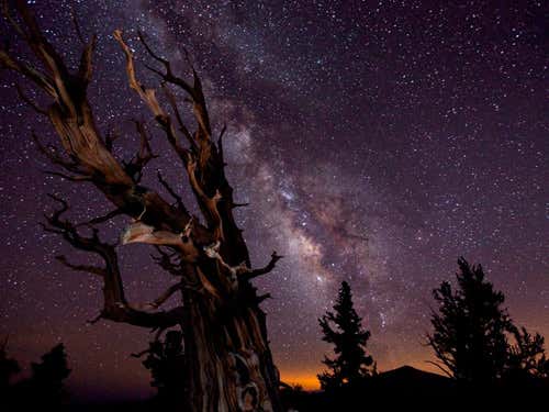 In the White mountains of California, an ancient bristlecone pine stands before the Milky Way as a meteor streaks through the night sky. The pine is the middle tree in the picture.