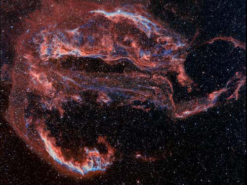 This photograph by Martin Pugh shows the Veil nebula, in the constellation Cygnus, which is the faint remnant of a supernova that exploded over 5000 years ago.