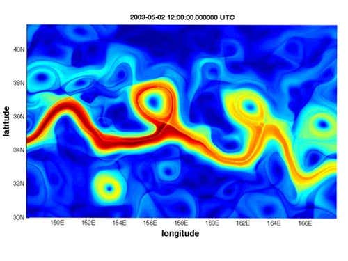 The complexity of the flows is illustrated in this analysis of satellite data on the Kuroshio current, the world’s second strongest current after the Gulf Stream. Here, fast-moving water (red) forms geometrical structures reminiscent of loops traced out by chaotic systems.