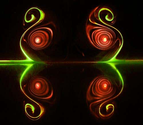 Air vortices often form around the wingtips of moving airplanes and can influence the planes’ motion when the aircraft are near the ground. The complexity of this flow is illustrated in this image, which was created by rotating flaps in fluorescent dye and illuminating the setup with laser light. In addition to a primary vortex (red), a secondary vortex (green) is created by the flow’s interaction with the ground.