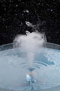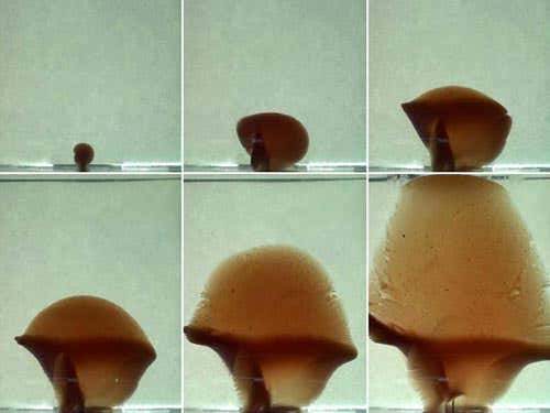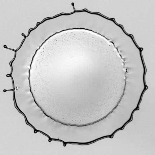 These differences disappear, though, at low air pressures, where splashing is completely suppressed for both types of fluids. This image was taken at atmospheric pressure, but when the pressure is reduced to a fifth of that level, drops of fluid simply spread smoothly and evenly when they hit a glass surface.