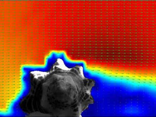 Here, a technique called particle image velocimetry is used to visualise fluid flow around a shell. Small tracer particles are suspended in the fluid and imaged to gauge fluid speed. Analysis of the images suggests rough shells have less drag when the fluid is fast-moving. But smoother shells are better when the fluid flow is slow.