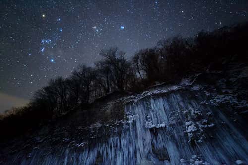 This is the winner of the Earth and Space category and was taken at a frozen waterfall in Nagano, Japan. In the sky we can clearly see Orion, Taurus and the Pleiades.