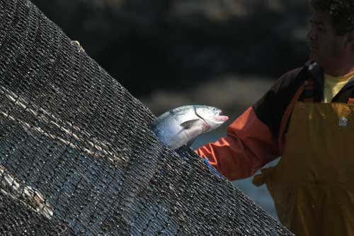 A fisherman catching wild salmon in Puget Sound, Washington. Urbanisation, fishing, dam building, forestry, agriculture, mining and poor artificial breeding practices have severely depleted wild salmon stocks.