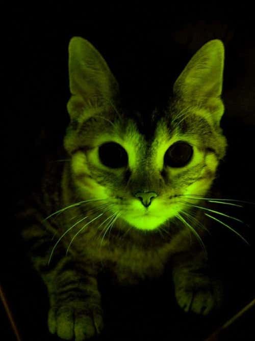 Thanks to the discovery of GFP, scientists have created new bioluminescent animals as part of their genetic research. This cat is resistant to feline HIV. Scientists inserted the jellyfish gene for GFP along with the gene for HIV resistance into a cat egg before it underwent IVF treatment. The offspring and their descendants glow under blue light, showing that both genes were successfully bred into the line of cats and that the properties of the HIV resistance gene can be tested.