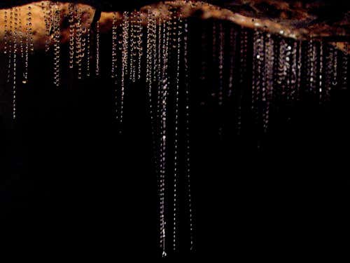 Found on the walls of caves and in other dark damp places, New Zealand’s glow worms Arachnocampa luminosa are the larvae for the fungus gnat. They create snares of mucus to trap midges, and their glowing tail is to lure their prey into the sticky trap.