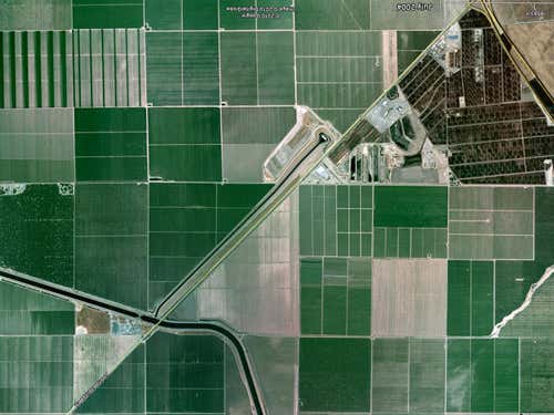 This photograph shows the effect of beef production in California’s Central valley in 2003: the dark brown areas are the animal pens and waste lagoons.