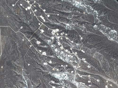 The upper Green river valley in Wyoming is part of the same ecosystem as Yellowstone and Grand Teton national parks, but is also rich in oil and natural gas. This picture shows the effect of natural gas drilling: the white areas are sites prepared for drilling, covering about 1.5 hectares, and the black spots within them are open pits of waste drilling fluid.