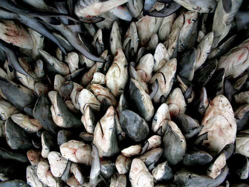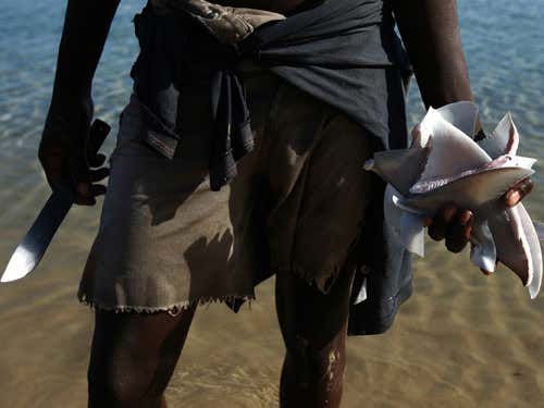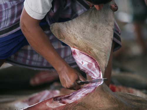 A bull shark (Carcharhinus leucas) being finned at a purpose-built shark market at the Red Sea port of Hodeidah, Yemen.