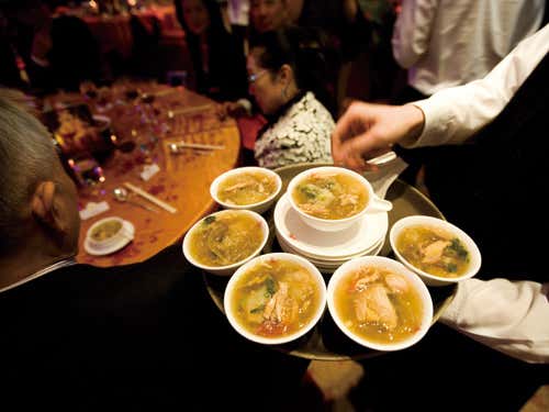 Bowls of shark fin soup being served at a wedding banquet in Hong Kong. It is traditional to serve expensive dishes, such as bird’s nest soup and abalone, at Cantonese weddings, but a high-profile Facebook campaign is starting to erode the shark fin habit.