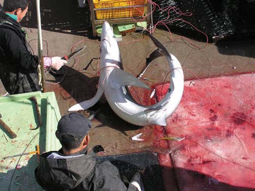 A blue shark (Prionace glauca) about to be finned on board a South Korean fishing vessel in South African coastal waters. Blue sharks are an endangered species.