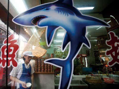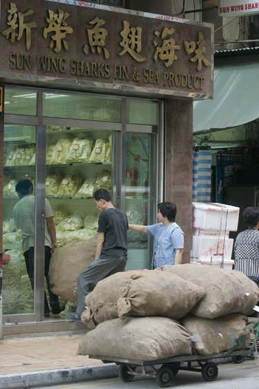 Bales of shark fins being delivered to a shop in Hong Kong. “I can’t go down to the shark fin warehouse area of Hong Kong now because they recognise me,” says Hofford.