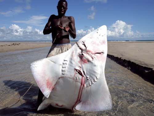 A fisherman showing off a shark ray) Rhina ancylostoma) in Pomene, Mozambique. “What made the shot for me was the exit wound of the knife and the hook in the mouth,” says photographer Hilton.