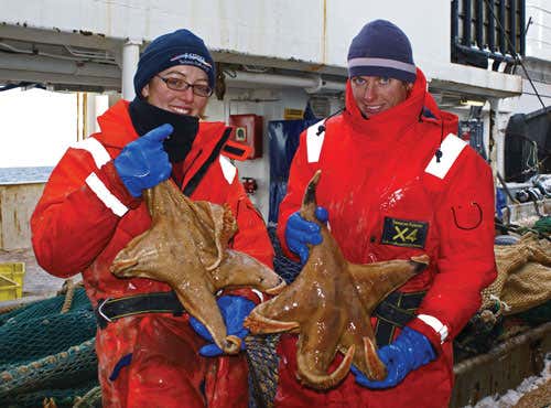 Here, researchers from the Census of Marine Life hold giant Macroptychaster sea stars that can grow up to 60 centimetres across.