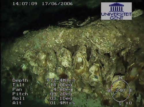 With the assistance of a remotely operated vehicle, marine explorers have found dense communities of giant oysters 20 cm long. The communities live 700 metres beneath the waves on the La Chapelle continental slope.