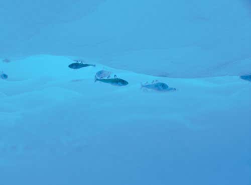 Ice cod feed on plankton just below the Arctic sea ice. Each spring, as the Sun rises over the Arcitc, life kicks off inside and just below the sea ice. One of the earliest signs of life are colonies of microscopic algae that grow inside the ice. It provides energy for the rest of the food chain.