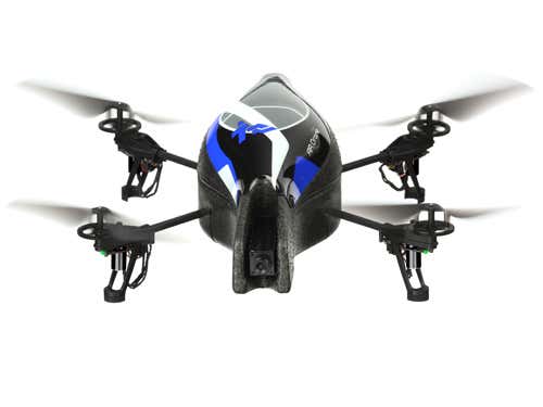 This carbon fibre quadricopter is controlled via Wi-Fi by an iPhone or iPod Touch. Using the accelerometer within the hand-held gadget, the user can turn the copter left or right simply by tilting the device. A camera mounted on front of the copter shows the user the tiny flier’s progress.