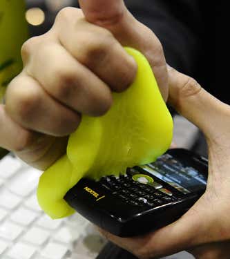 This odd-looking goo is actually a cleaning product. Cyber Clean is designed to collect and absorb dust and dirt that collects in hard-to-reach cavities such as those around the keys on phone and computer keyboards.