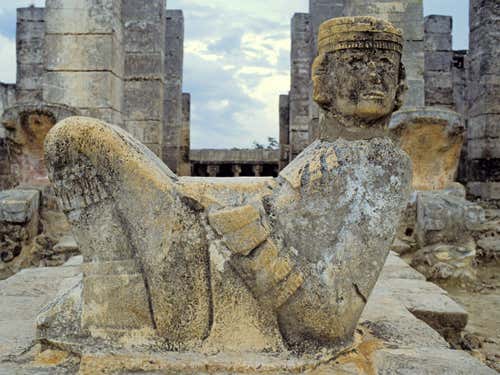 This statue represents the god Chac-Mool in the Mayan city of Chichen Itza, in what is now Mexico. Chichen Itza thrived until the 13th century, and there were still Maya living there when the Spanish arrived in the 16th. However, the heyday of the civilisation was between 200 and 800 AD, when the construction of great monuments reached its apogee. After 900 AD, many cities were abandoned.
