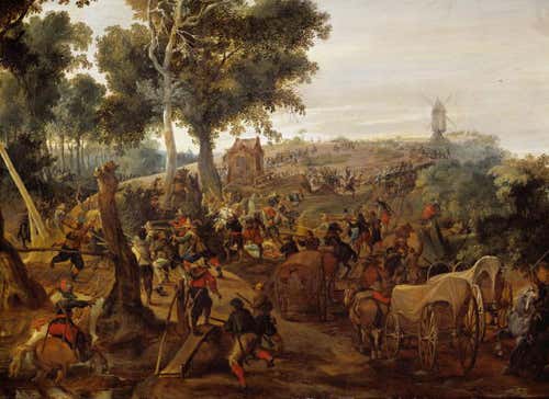 This oil painting by Flemish artist Pieter Snayers shows an attack on a supply column during the Thirty Years war, which was fought from 1618 to 1648. It was one of the longest and most destructive periods of war in Europe’s history. During the 17th century there were many other wars, revolts and conflicts. This period of instability is known as the General Crisis.